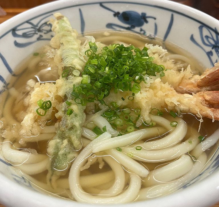 Bold, chewy noodles crowned with a large kakiage tempura.