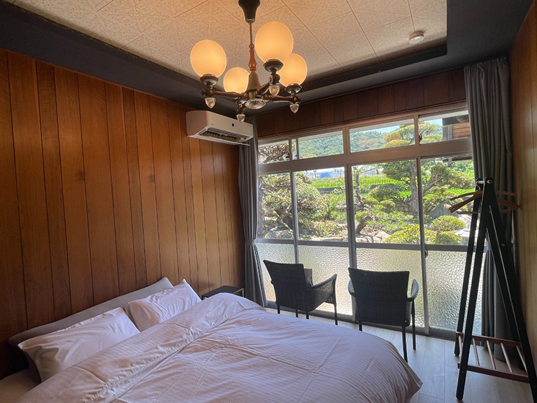 昭和ガラスとレトロな照明の洋室からは